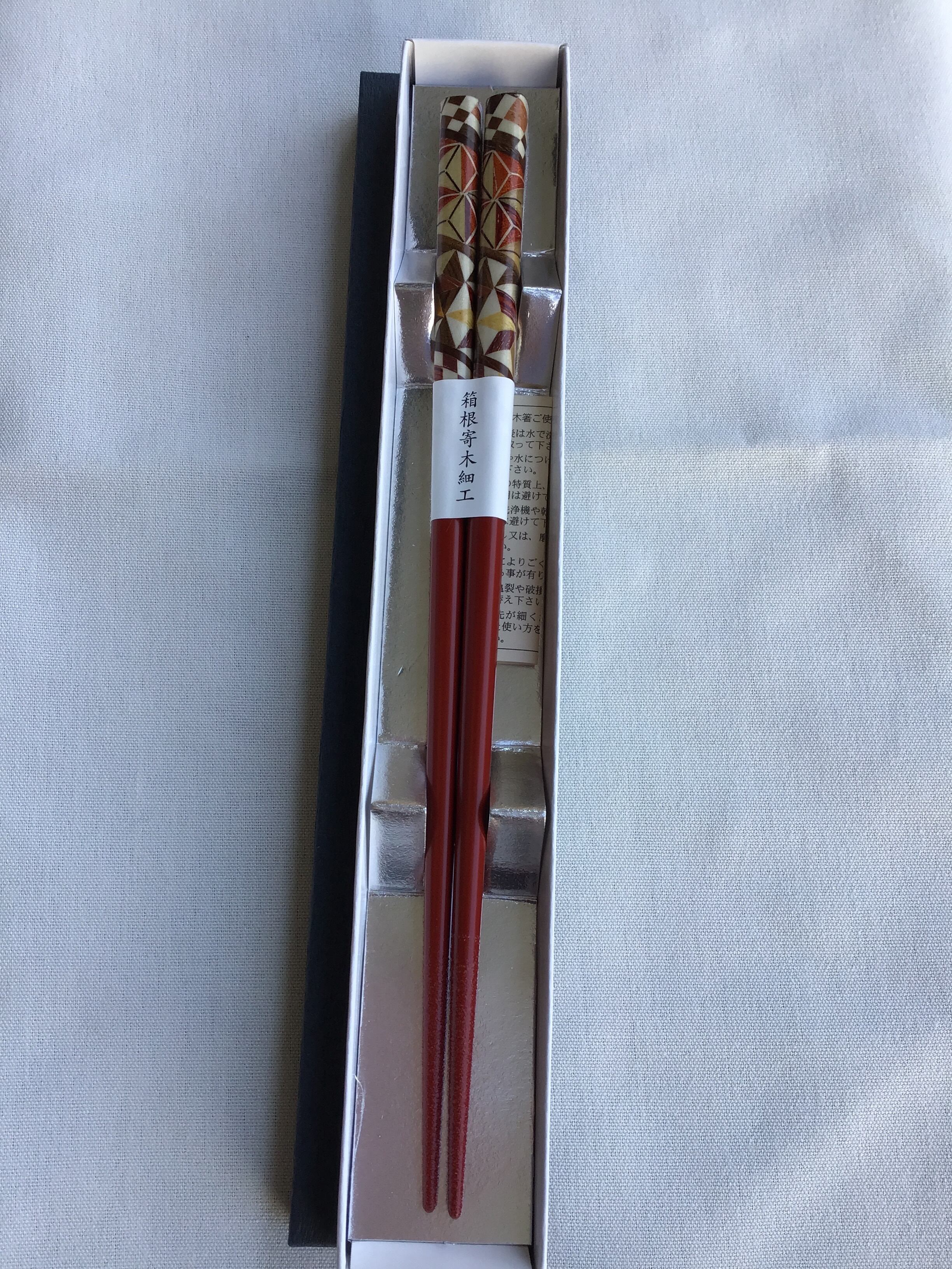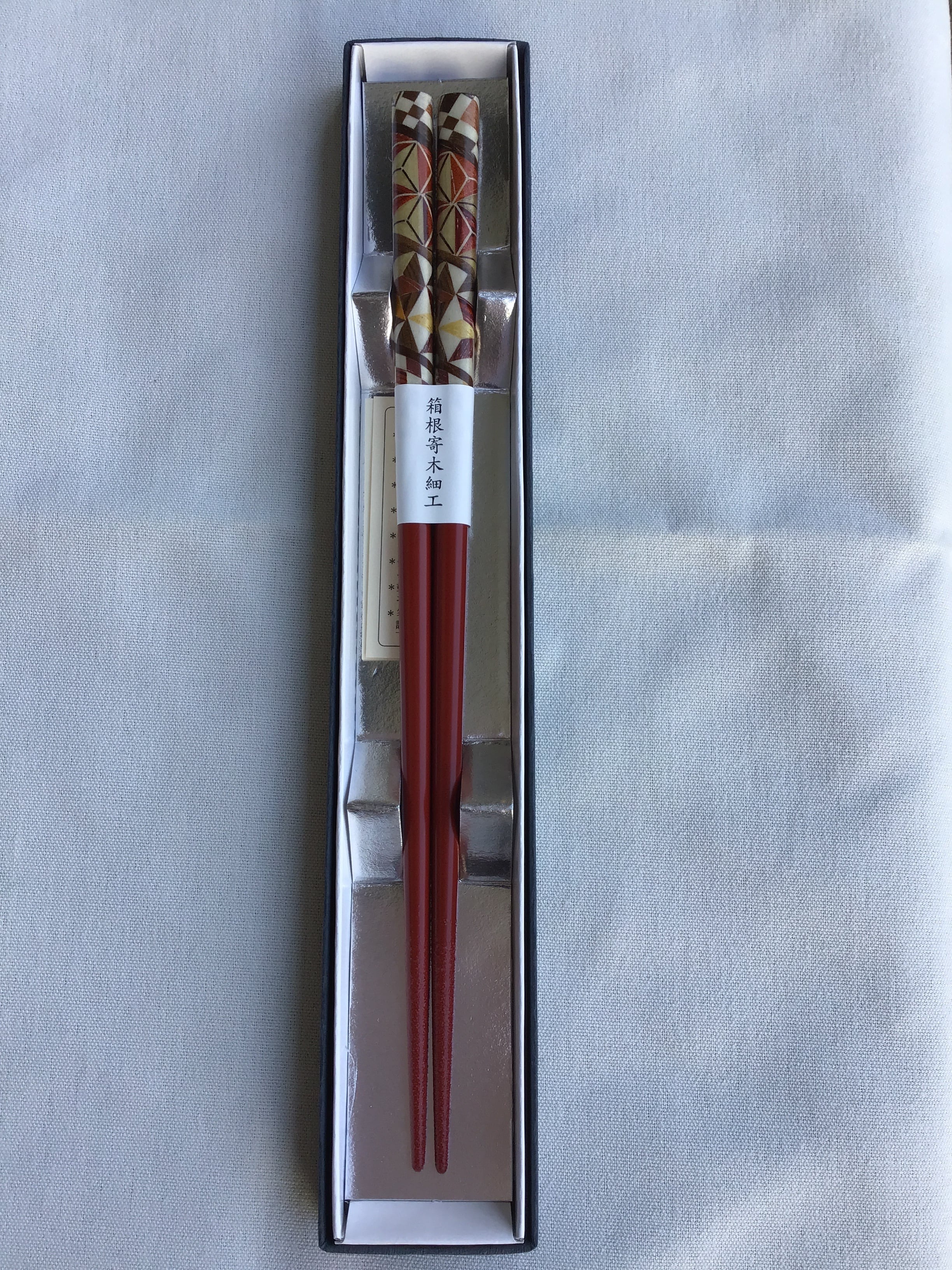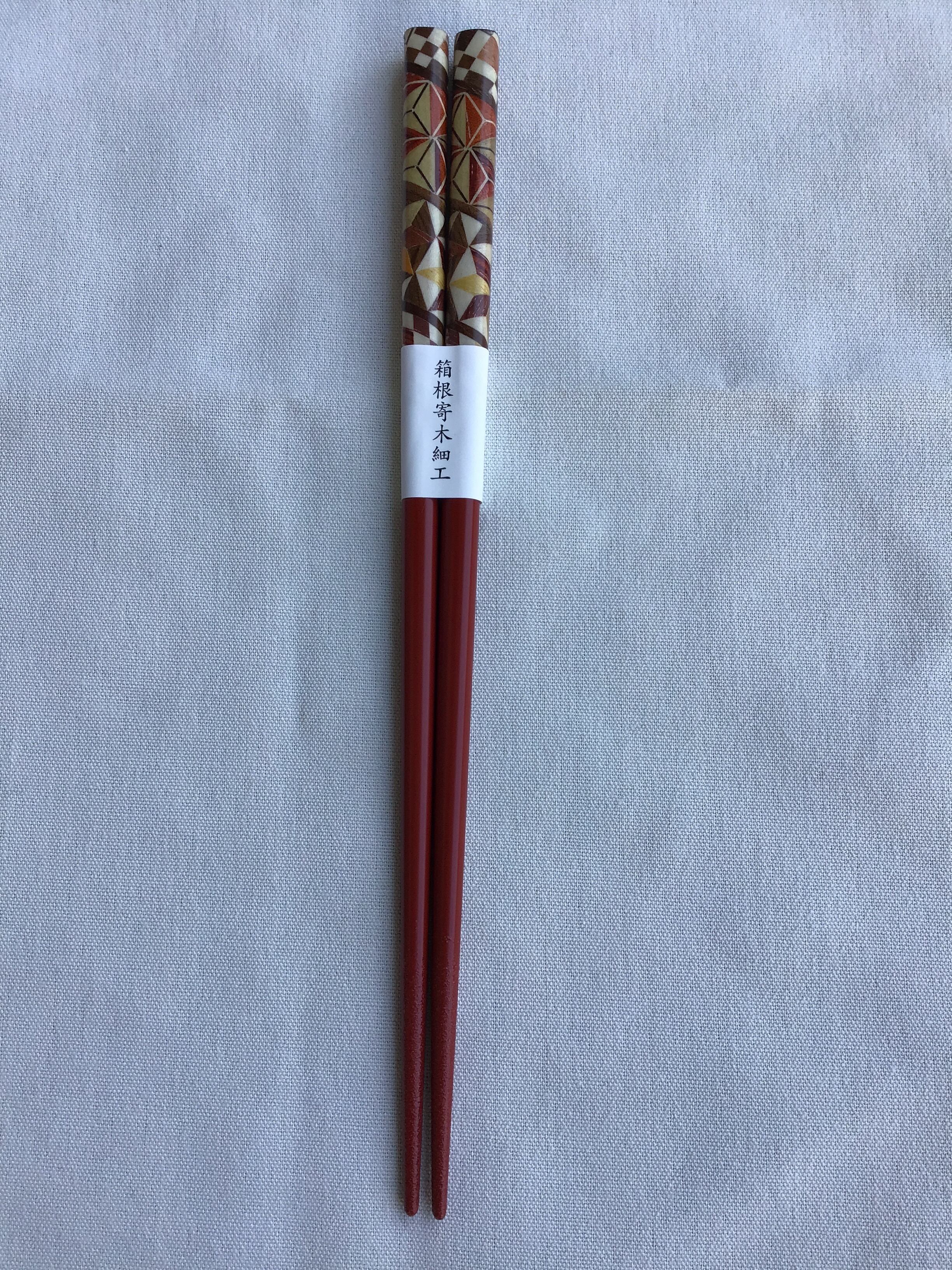 箱根独自の文様表面を鉋でスライスしたズク技法で作ったシートを箸に巻いて仕上げました。