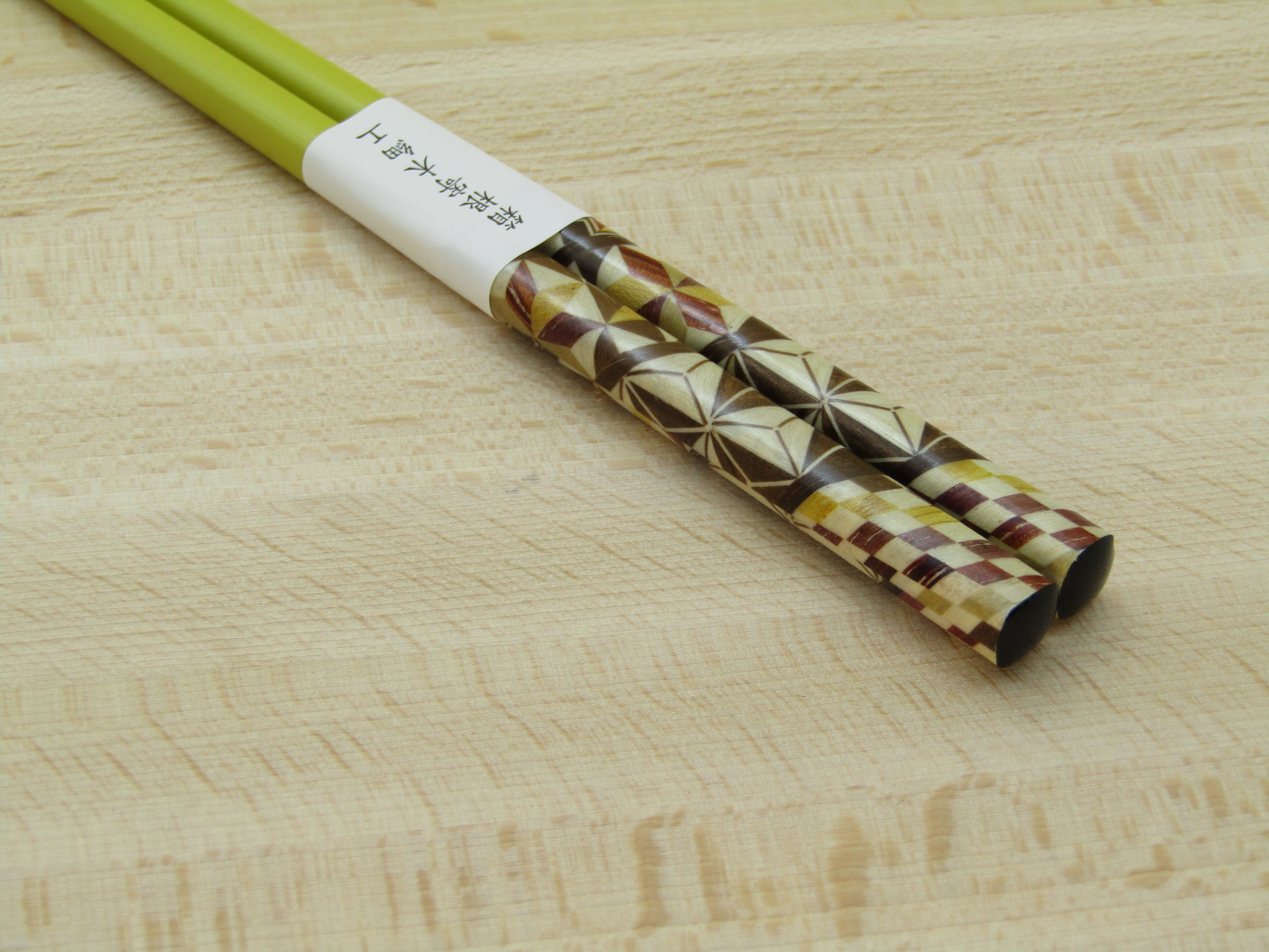 箱根独自の文様表面を鉋でスライスしたズク技法で作ったシートを箸に巻いて仕上げました。