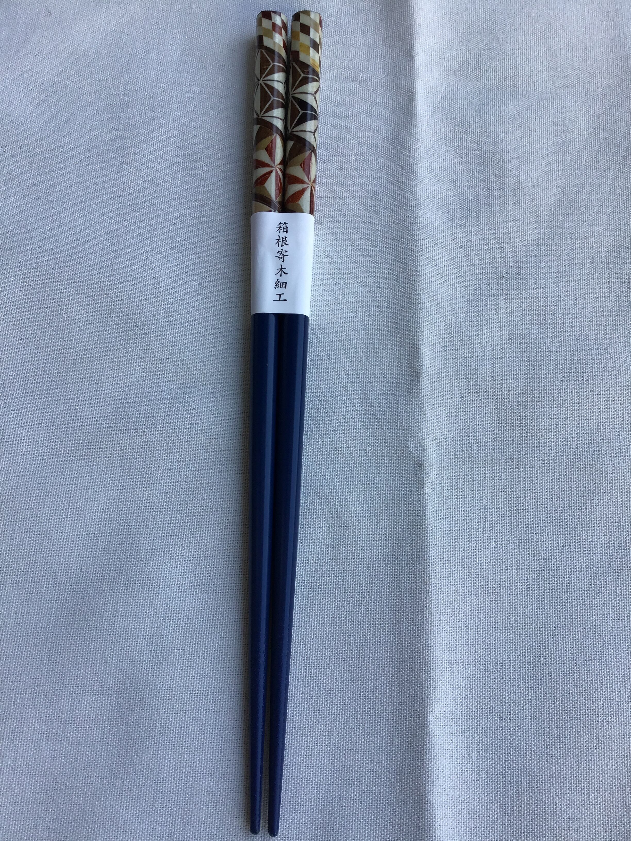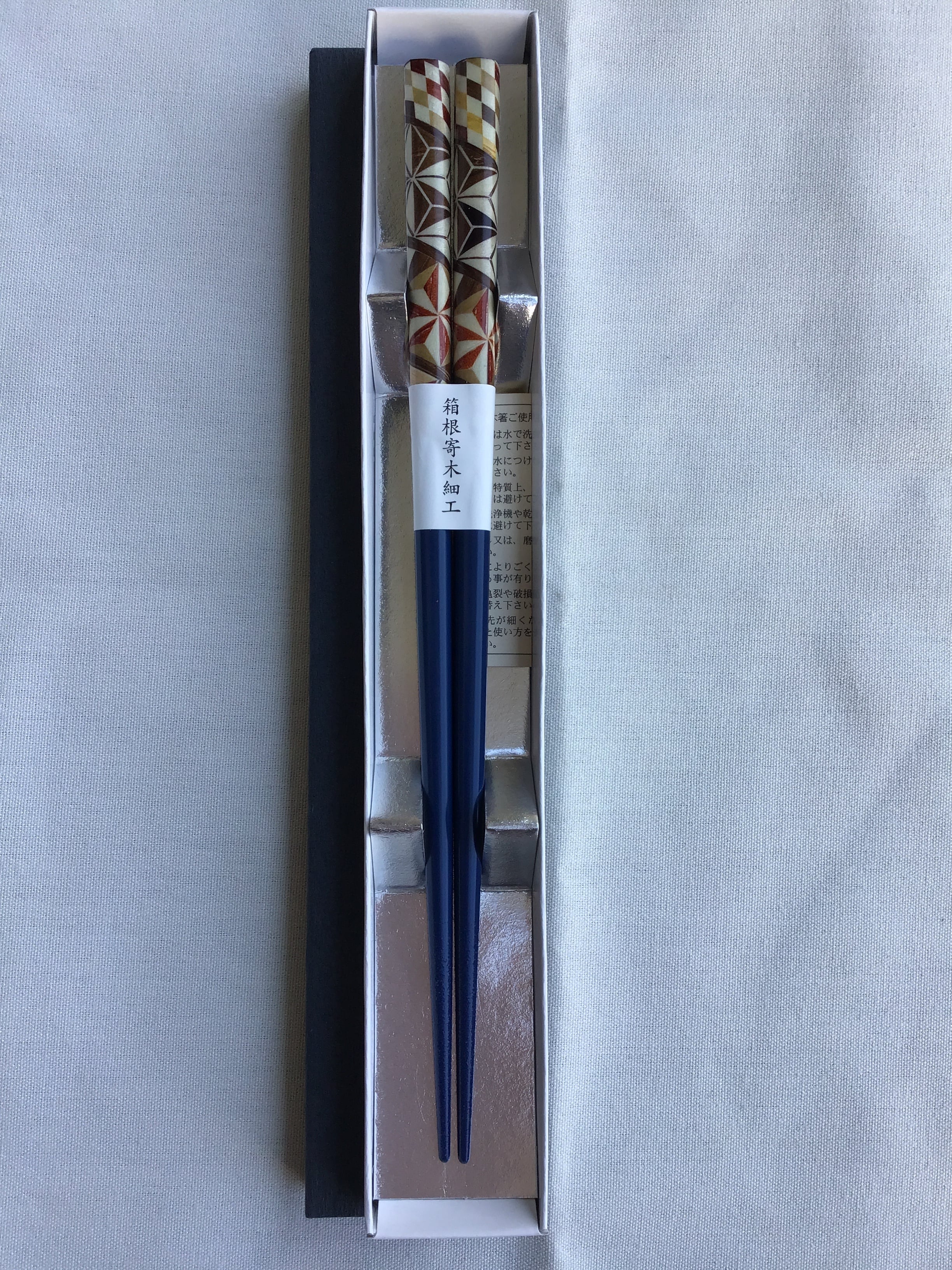 箱根独自の文様表面を鉋でスライスしたズク技法で作ったシートを箸に巻いて仕上げました。