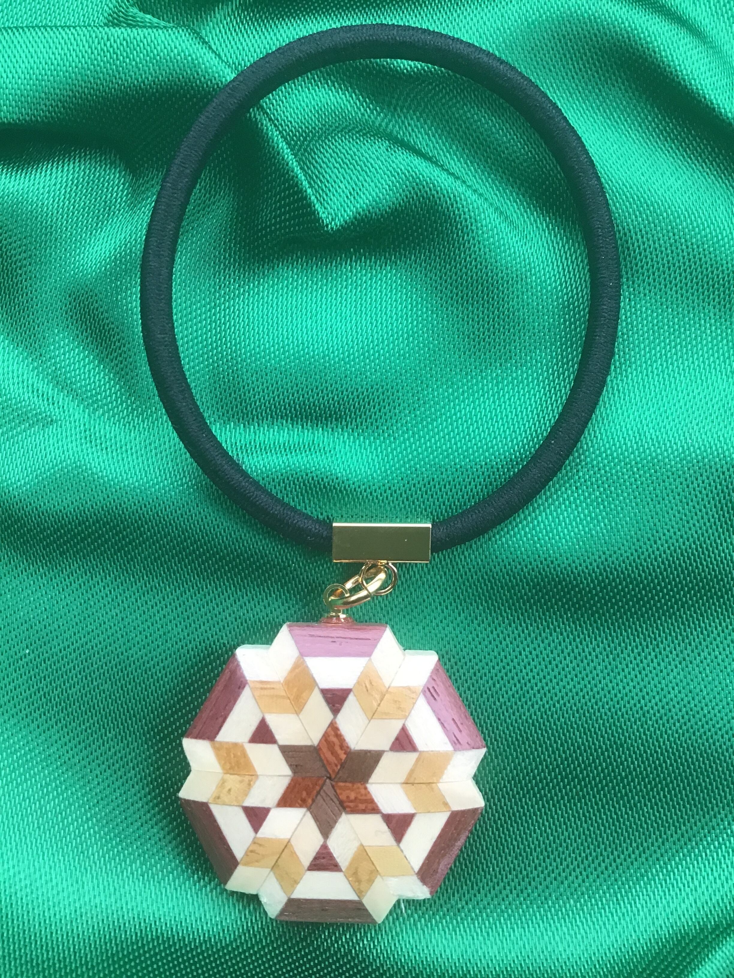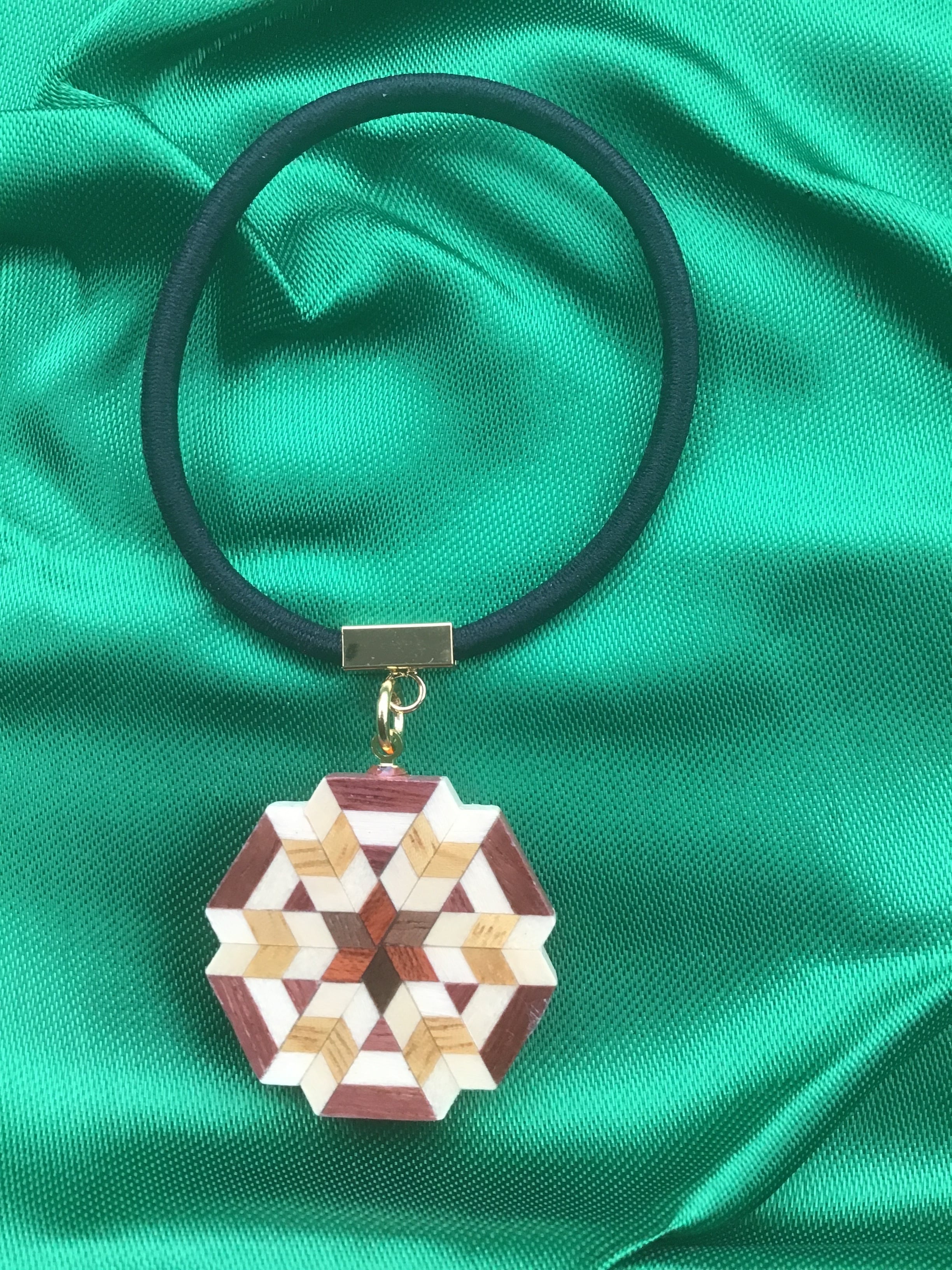 天然有色木材を組み合わせた寄木のブロックを、矢羽根柄に仕上げました。