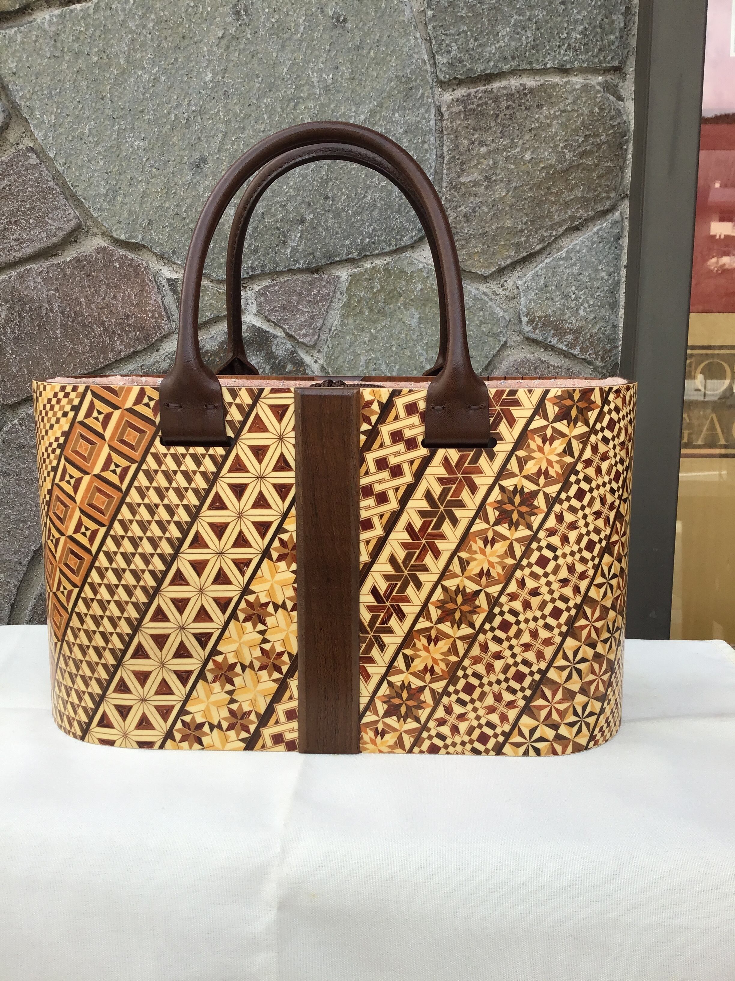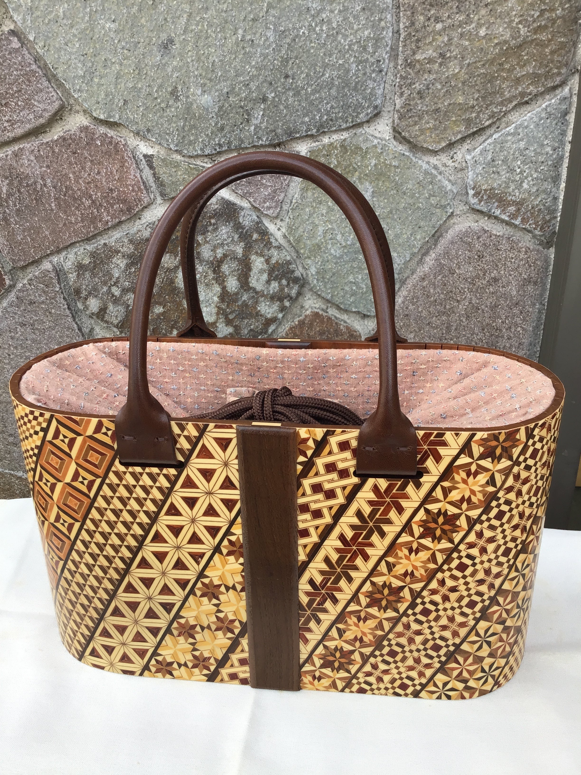 バッグ本体はウォールナット材を使い 持ち手は本皮 中袋は綿です。
