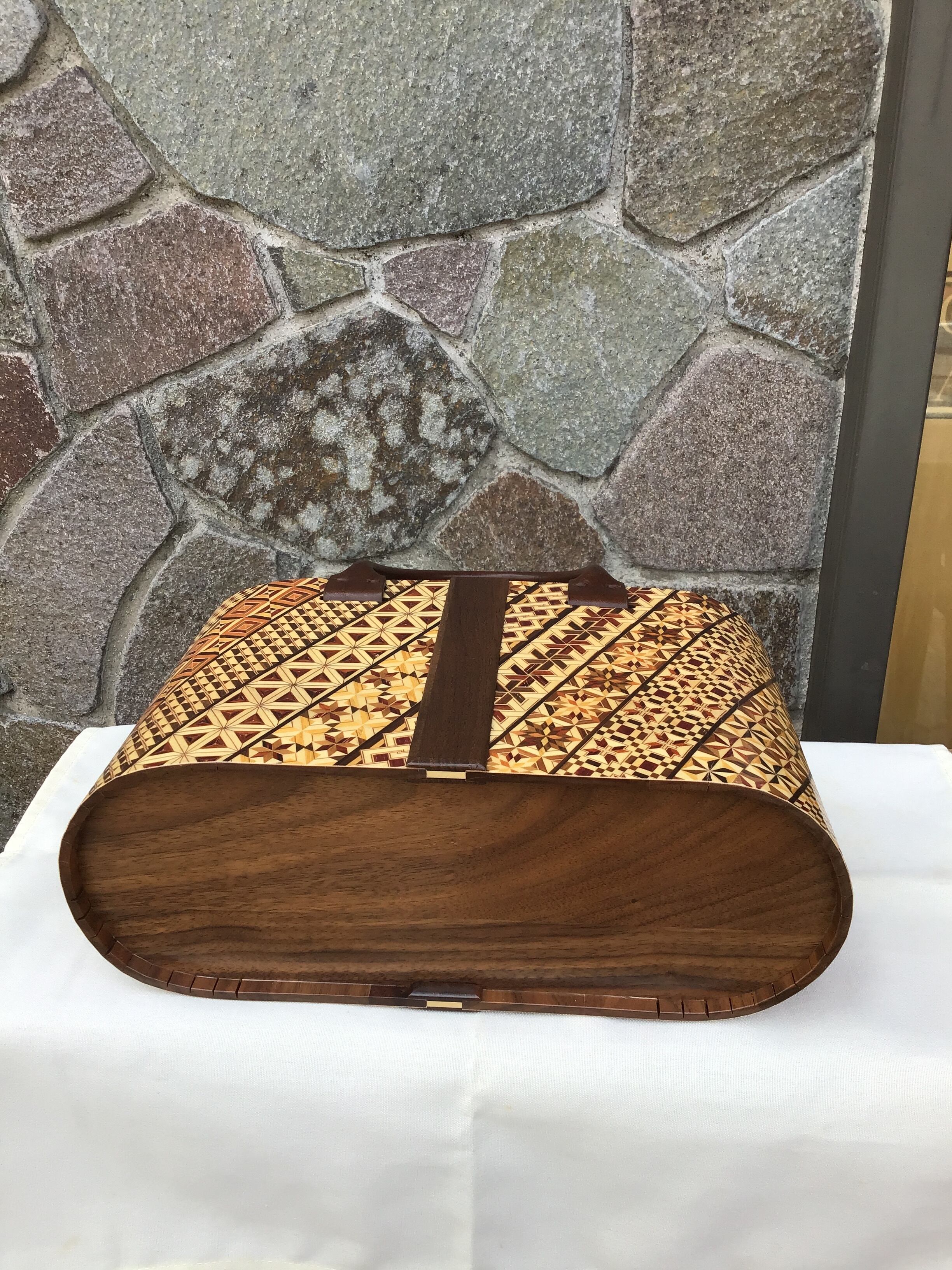 様々な種類の天然有色材を組み合わせ、箱根独自の文様表面を鉋でスライスしたズク技法。