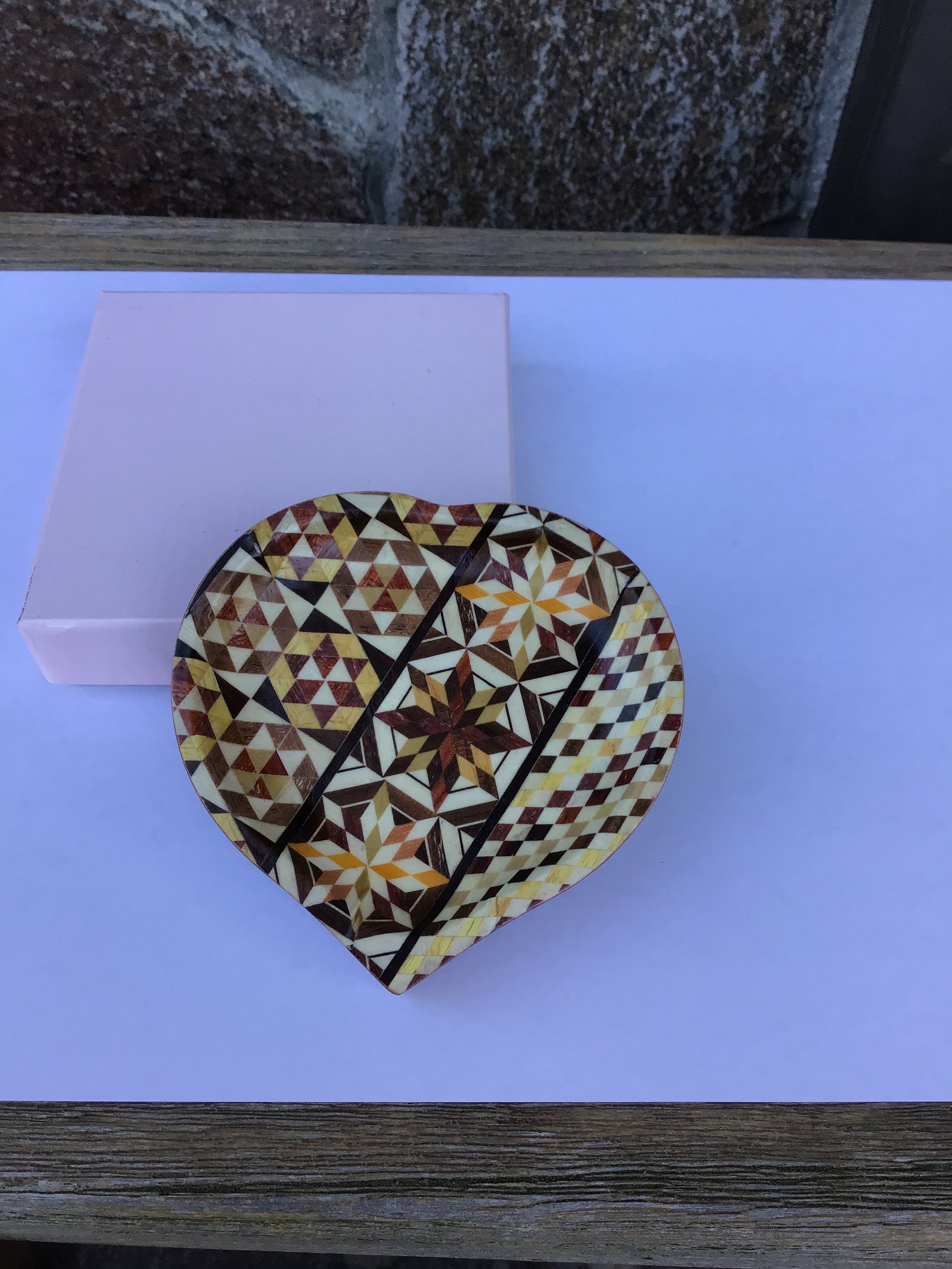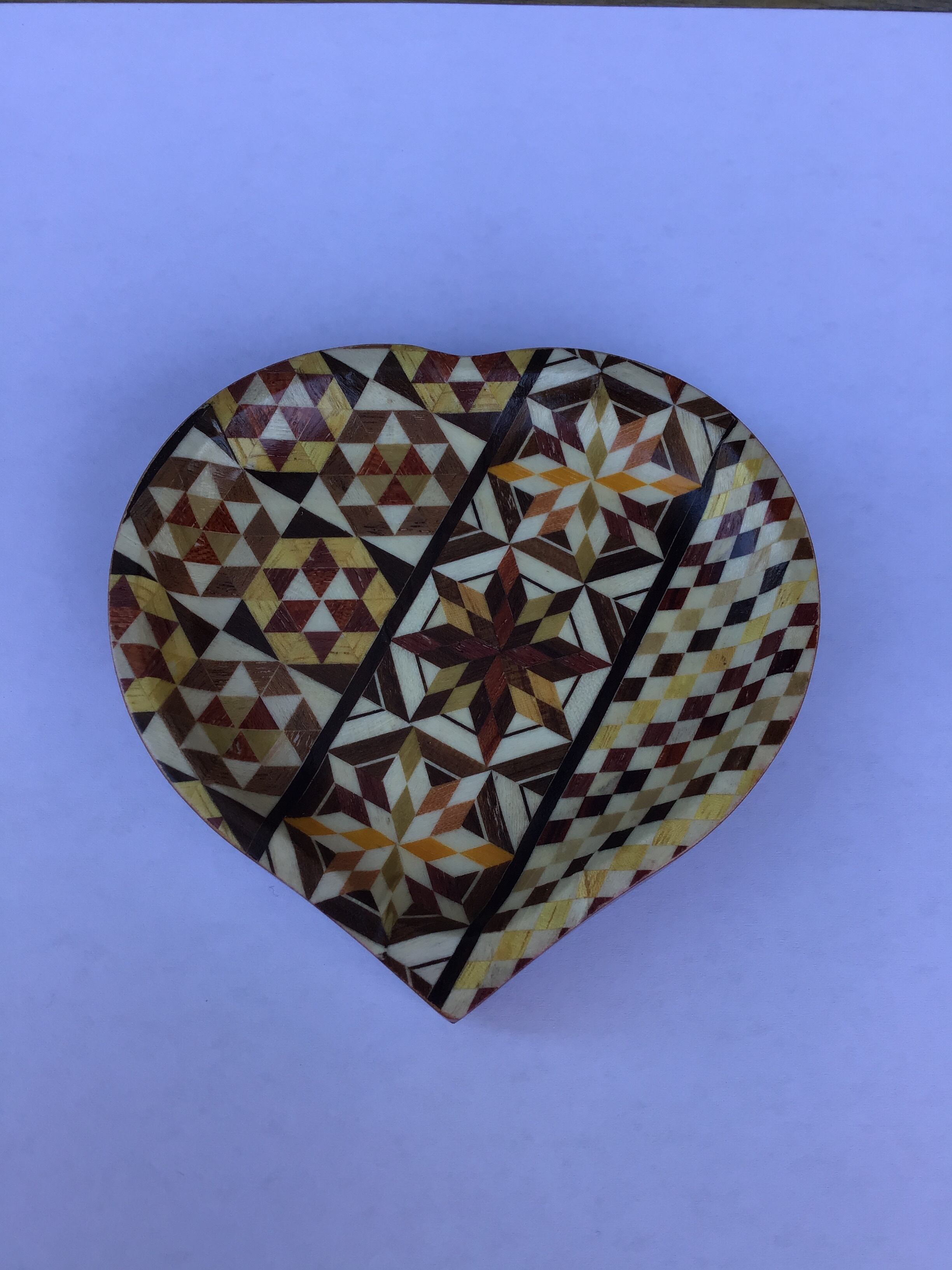 箱根独自の文様表面を鉋でスライスしたズク技法で作ったシートを凹面に貼りつけた小さなトレーです。