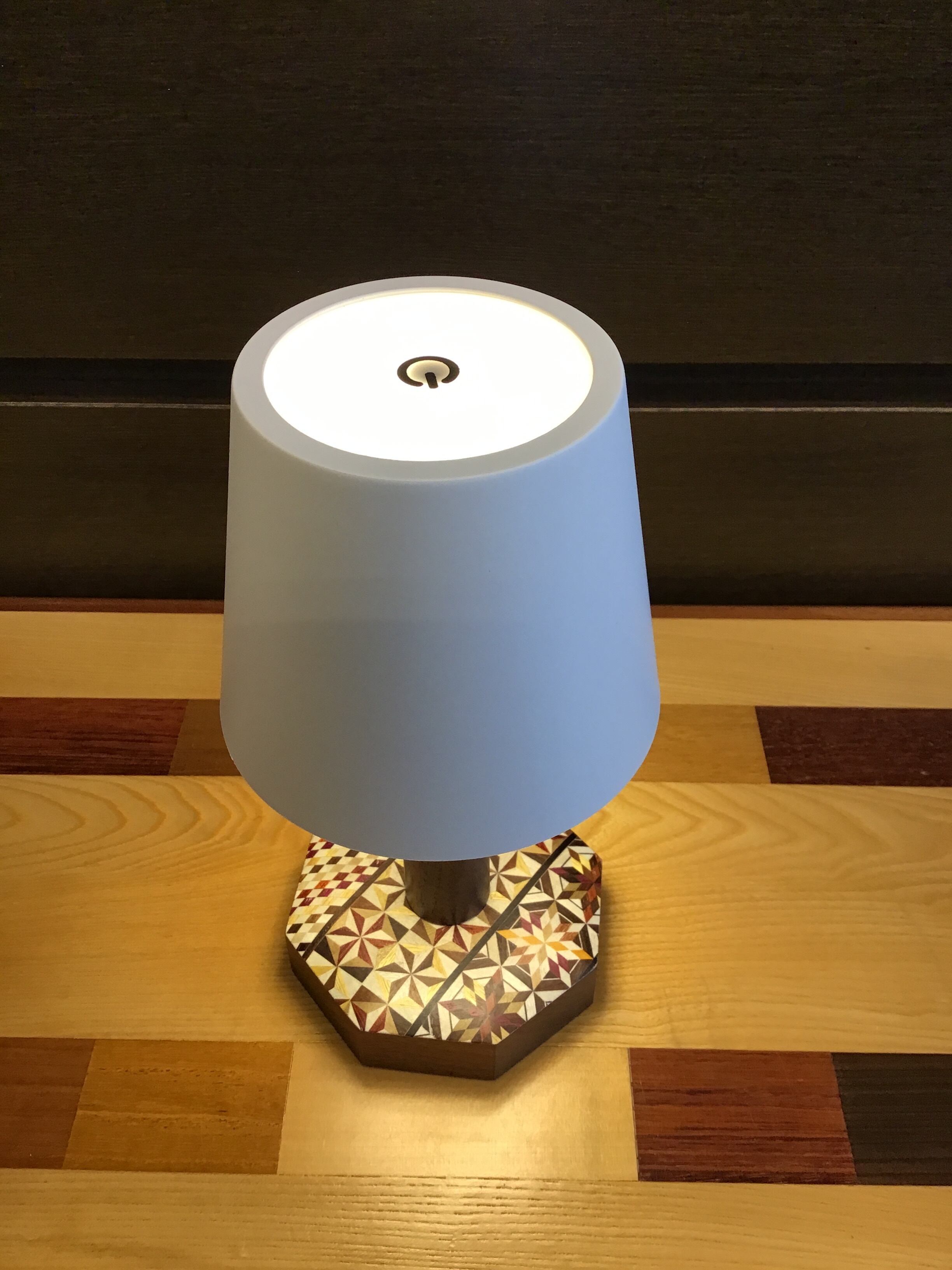 薄い紙状の寄木ズクを加工しテーブルスタンドに仕上げました。